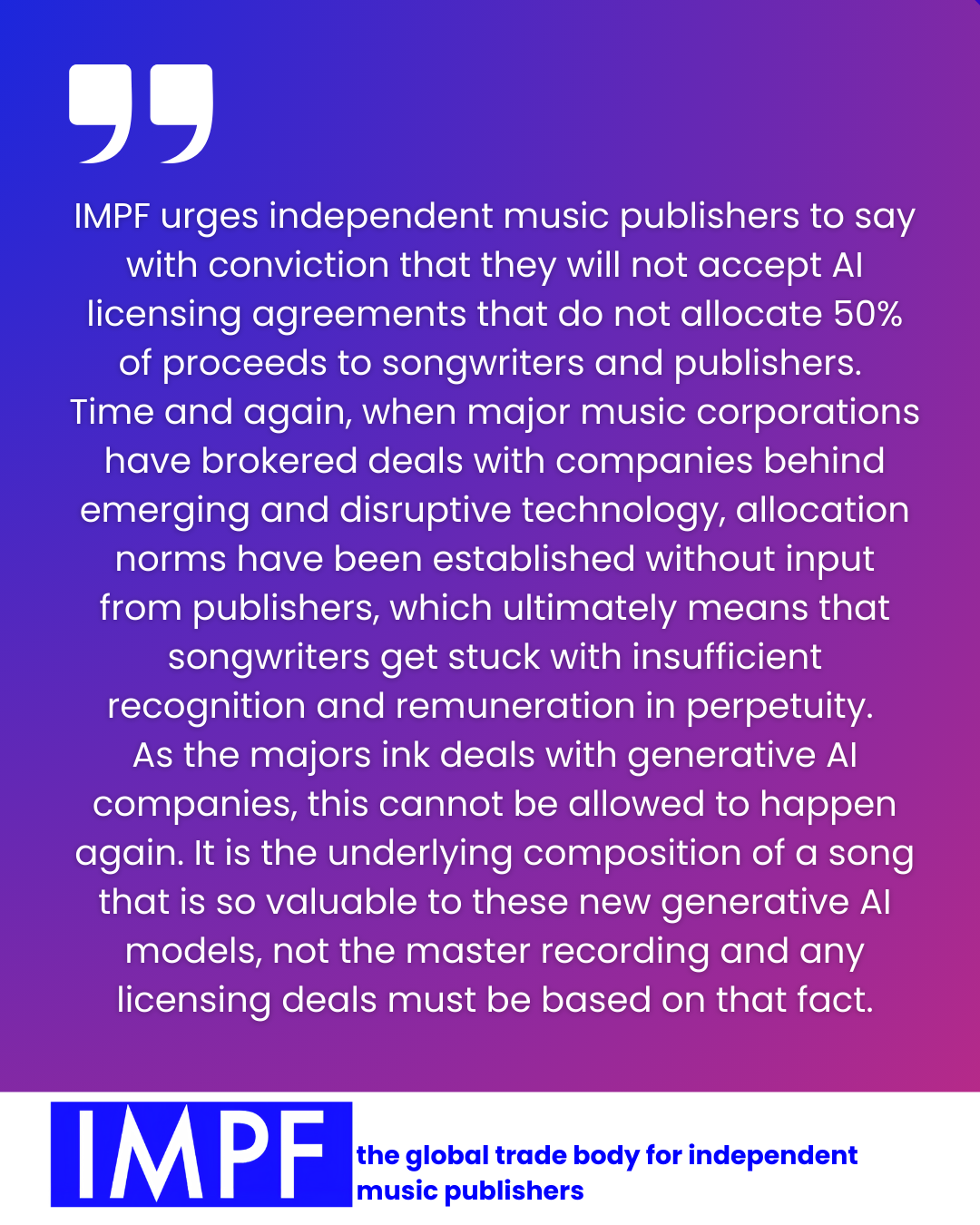 “IMPF urges independent music publishers to say with conviction that they will not accept AI licensing agreements that do not allocate 50% of proceeds to songwriters and publishers. Time and again, when major music corporations have brokered deals with companies behind emerging and disruptive technology, allocation norms have been established without input from publishers, which ultimately means that songwriters get stuck with insufficient recognition and remuneration in perpetuity. As the majors ink deals with generative AI companies, this cannot be allowed to happen again. It is the underlying composition of a song that is so valuable to these new generative AI models, not the master recording and any licensing deals must be based on that fact.”